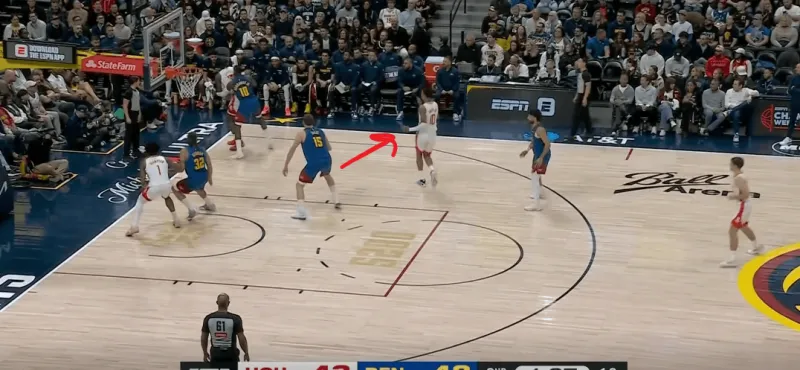 转换进攻掘金四打二,约基奇身后跟进,利用火箭两名退防人优先回收禁区,直接找到左侧外弹重新定位的约翰逊命中底角三分: